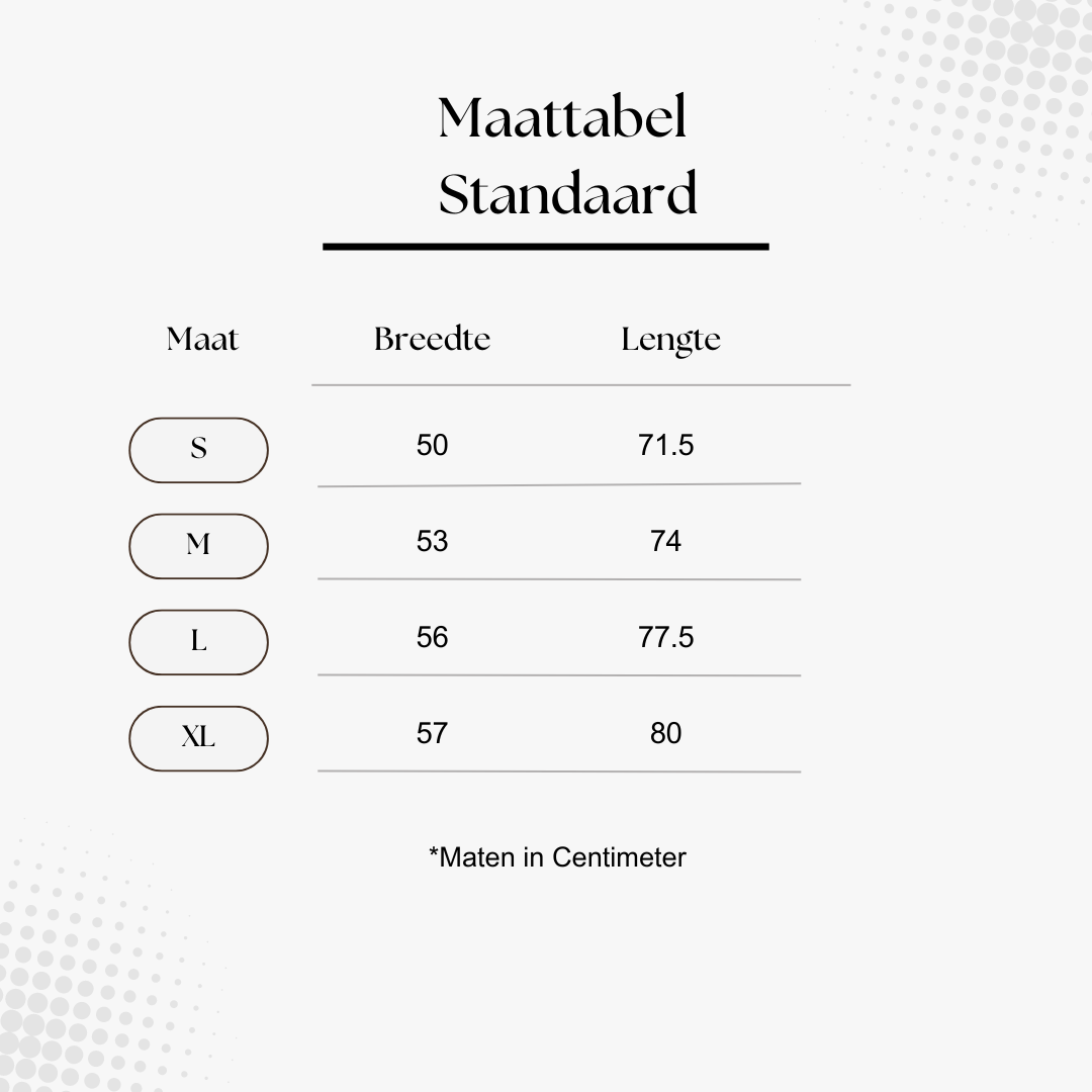 Bij One T(h)ree Six vinden we het belangrijk dat onze klanten de perfecte pasvorm vinden bij het kopen van een T-shirt. Daarom hebben we een handige maattabel opgenomen voor de maten S tot XL.