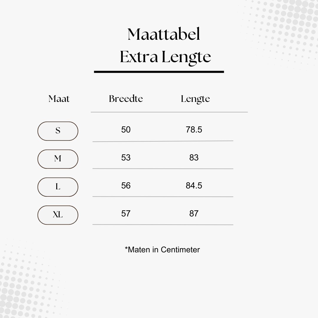 Naast standaardmaten biedt One T(h)ree Six optie tot extra lengtematen aan. Deze maten zijn 7 cm langer dan standaardmaten, waardoor ze perfect zijn voor mensen die op zoek zijn naar een T-shirt dat beter aansluit op hun lichaam en niet te kort is. Extra lengtematen zijn ideaal voor mensen die bijvoorbeeld wat langer zijn, of voor mensen die gewoon de voorkeur geven aan een T-shirt dat iets langer valt.